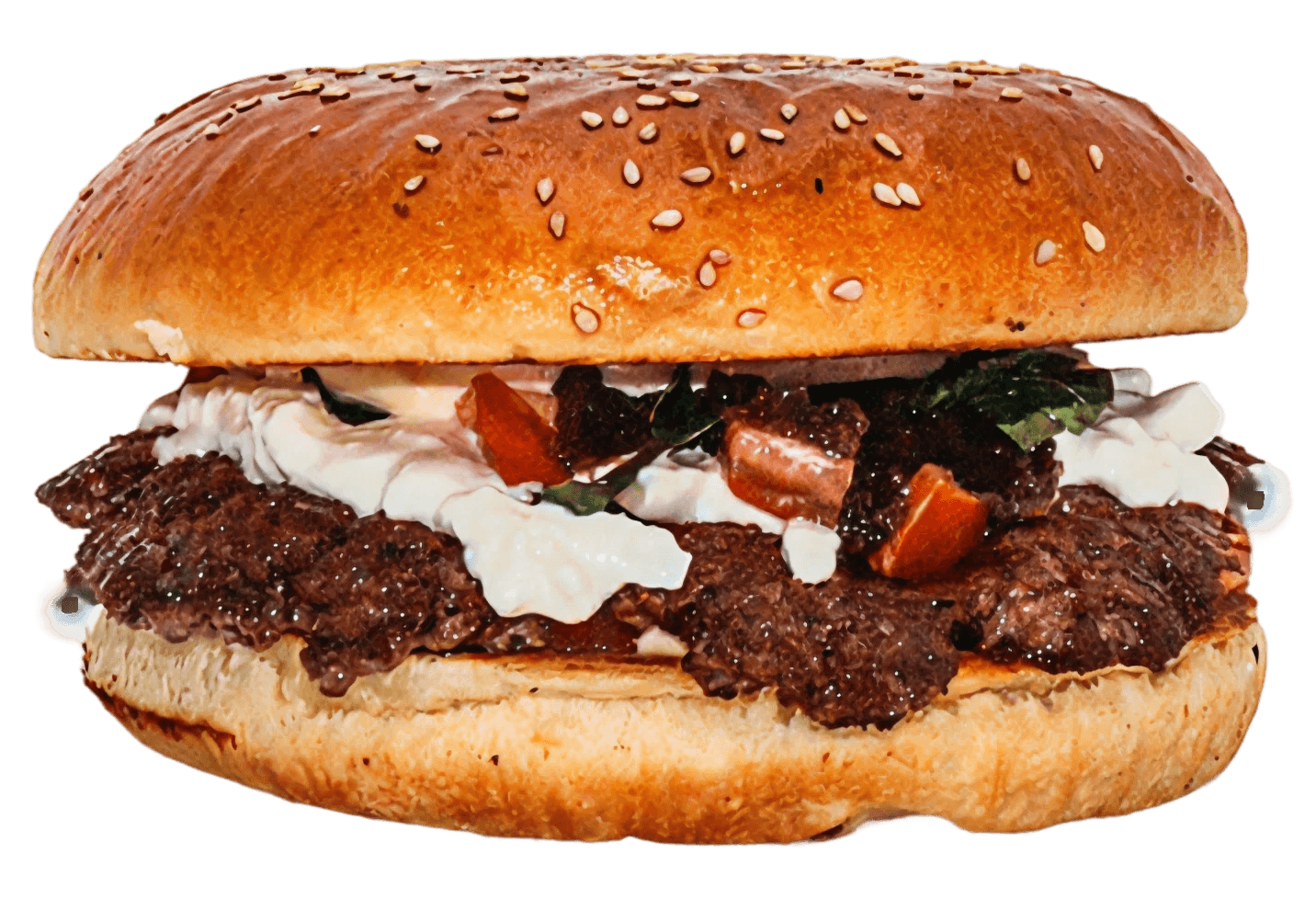 Saftiges Beef, geschmolzener Cheddar, Burrata, frische Tomaten, Basilikum und unsere geheime Sauce auf getoastetem Brioche-Bun.