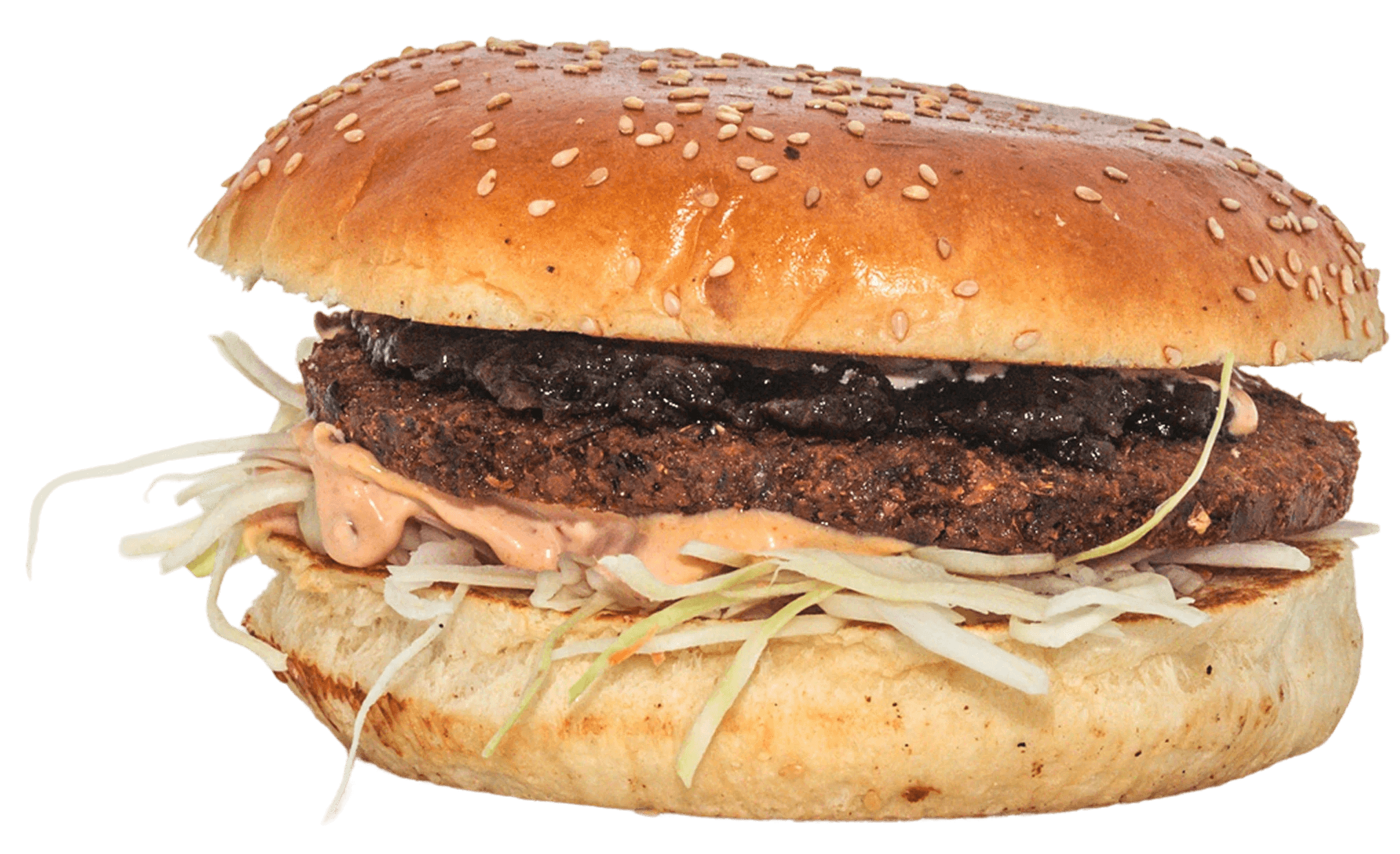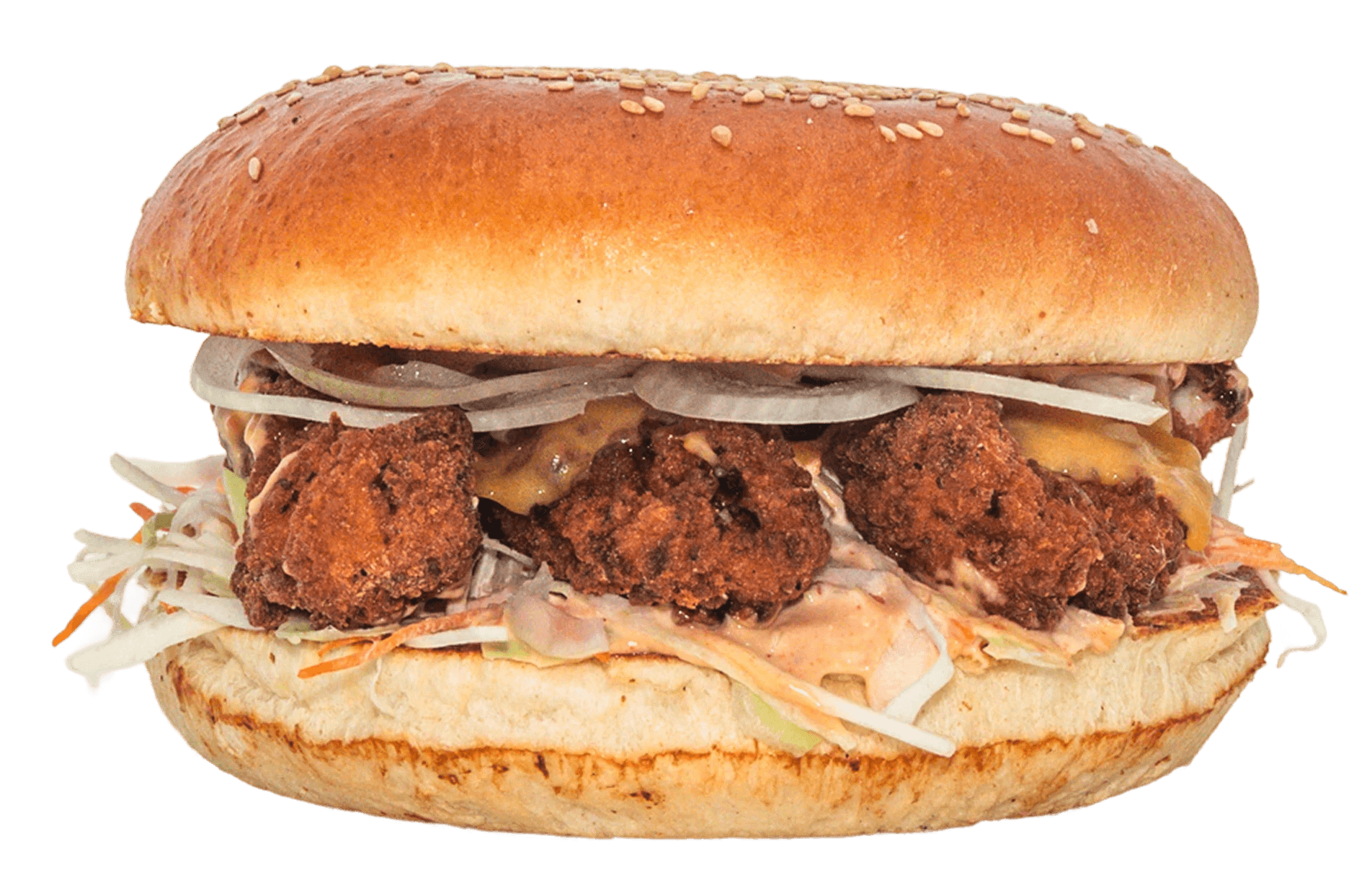 Knuspriges Falafel-Patty, geschmolzener Cheddar, Coleslaw, kandierte Zwiebeln und unsere geheime Sauce auf getoastetem Brioche-Bun.